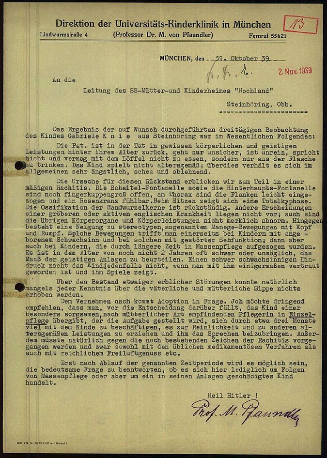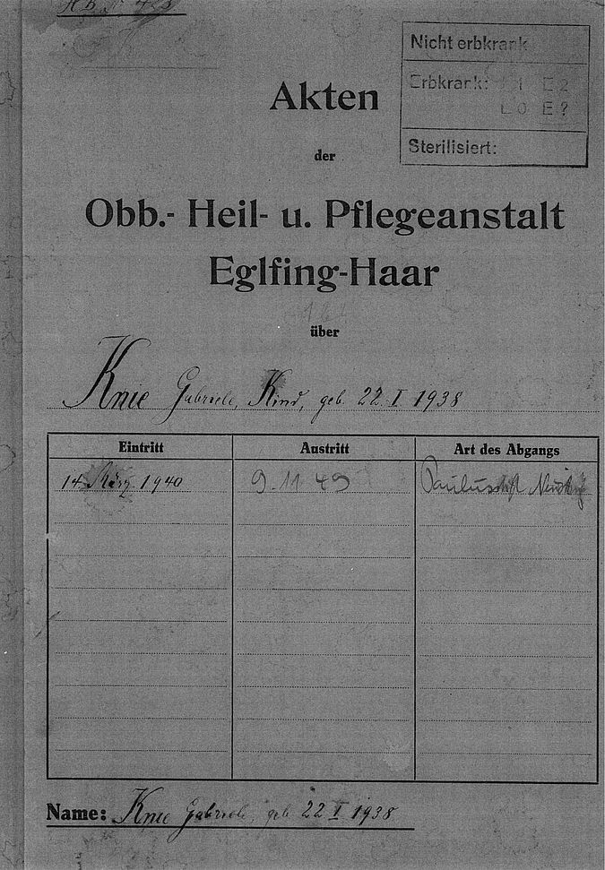 Ende Januar 1938 wird Gabriele im Lebensborn-Heim „Harz“ (Wernigerode) geboren. Wenig später bringt man sie nach Steinhöring, ins bayerische Heim „Hochland“. Ihre – unverheiratete - Mutter tritt eine Stelle in der Münchner Lebensborn-Zentrale an. Dort arbeitet auch ihr späterer Ehemann, den sie schon aus Berlin kennt. Im November 1938 heiraten die beiden. Gabriele bleibt weiter in Heim „Hochland“. Bis zu diesem Punkt konnte ich Gabrieles Weg rekonstruieren, mithilfe von Dokumenten aus den Arolsen Archives. Nur: Was war mit dem Mädchen weiter geschehen? War es durch Luminal, Nahrungsentzug und Vernachlässigung getötet worden? Gehörte es zu den 312 Kindern, die in Eglfing-Haar auf diese Weise ums Leben kamen?[7] [1] Arolsen Archives 4.1.0 / 82460690 [2] Arolsen Archives 4.1.0 / 82460691 [3] Arolsen Archives 4.1.0 / 82460693 [4] Arolsen Archives 4.1.0 / 82460711 [5] Arolsen Archives 4.1.0 / 82460715 [6] Arolsen Archives 4.1.0 / 82460708 [7] Julia Katzur: Münchner Kinder und Jugendliche als Opfer der „Kindereuthanasie“ in der „Kinderfachabteilung“ der Heil- und Pflegeanstalt Eglfing-Haar. Seite 76. In: Gedenkbuch für die Münchner Opfer der nationalsozialistischen „Euthanasie“-Morde. Göttingen 2018, S. 73-81 |